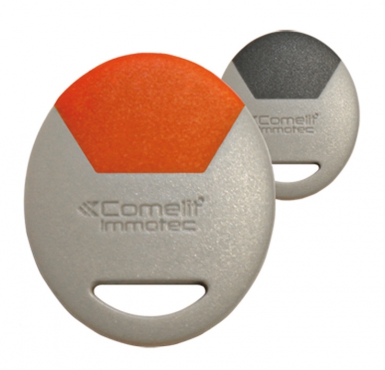 BADGE ÉLECTRONIQUE DE PROXIMITÉ MIFARE DE COULEUR GRIS/ORANGE.