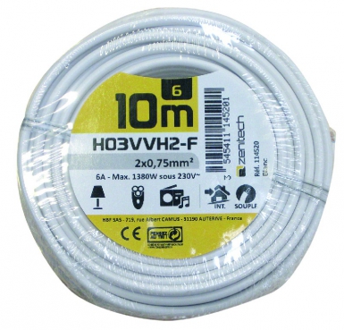 CÂBLE SOUPLE HO3VV H2-F ÂME CUIVRE NU CÂBLÉ 2X0,75 MM2 BLANC – ROULEAU 10 M – PRIX À LA PIÈCE.