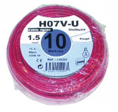 FIL RIGIDE HO7V-U ÂME CUIVRE NU MASSIF 1,5 MM2 ROUGE – ROULEAU 10 M
